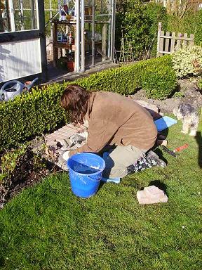 | 1e en 2e week: het derde en vierde rijtje wordt gemetseld De stenen zijn gehalveerd om de rondingen makkelijker te maken, ik gebruik nu wél metselspecie voor buiten Als het metselwerk af is dan ga ik het helemaal afsmeren met een 'waterdichte' metselspecie |
